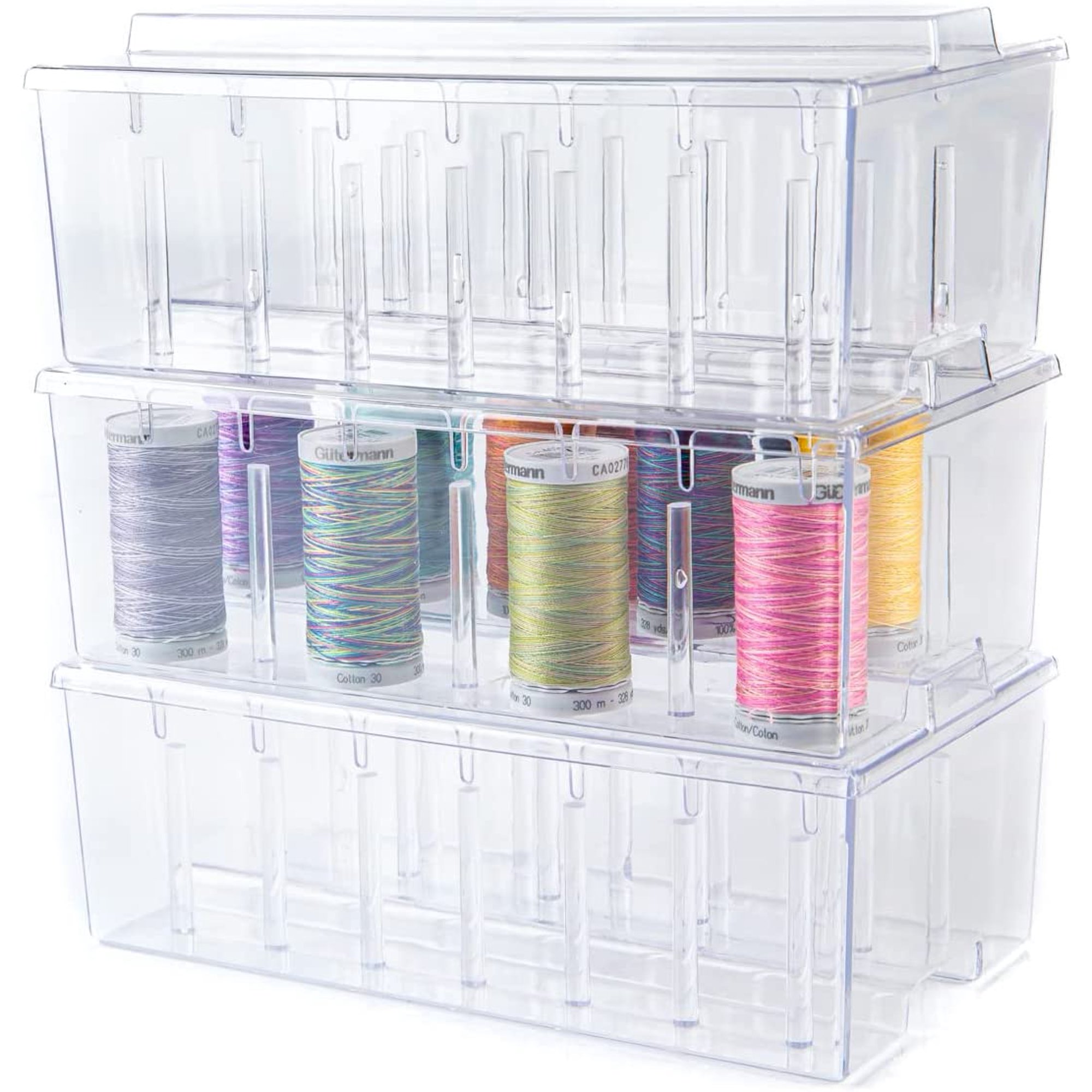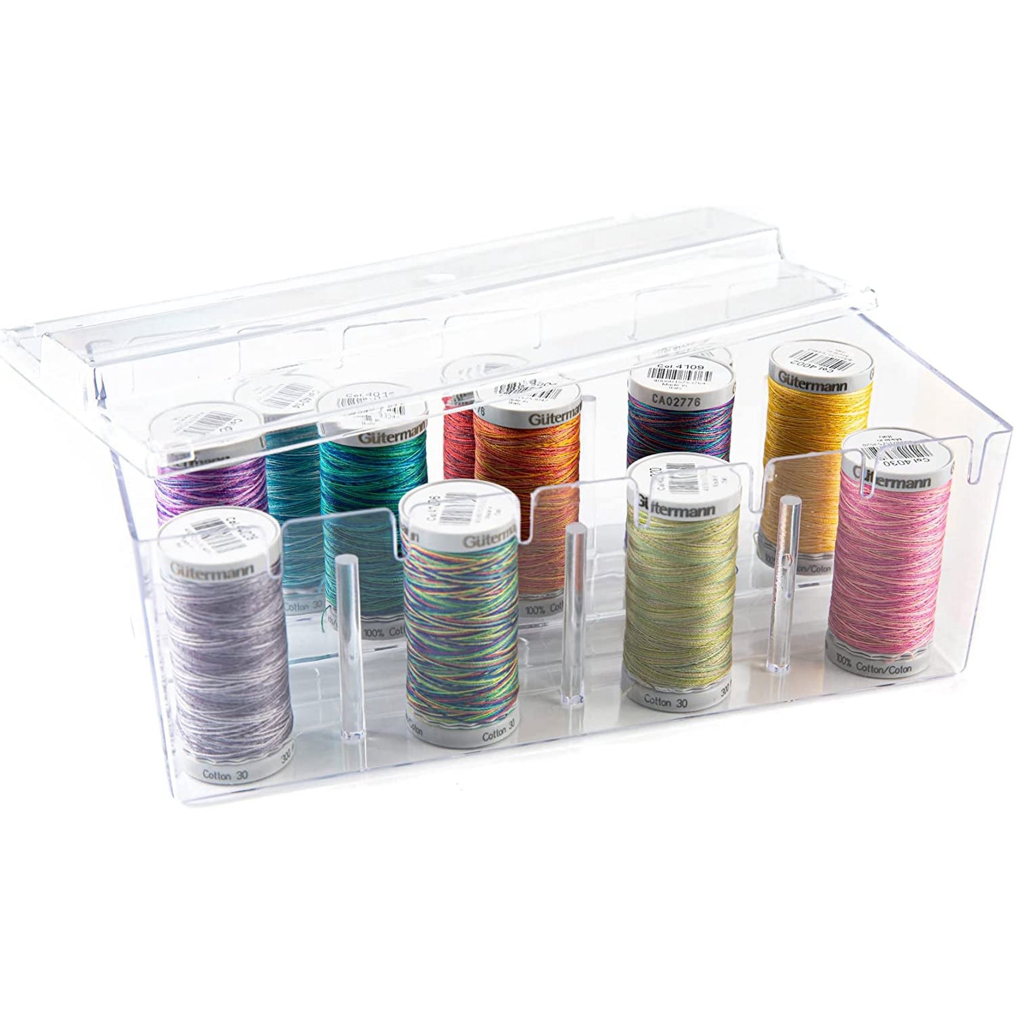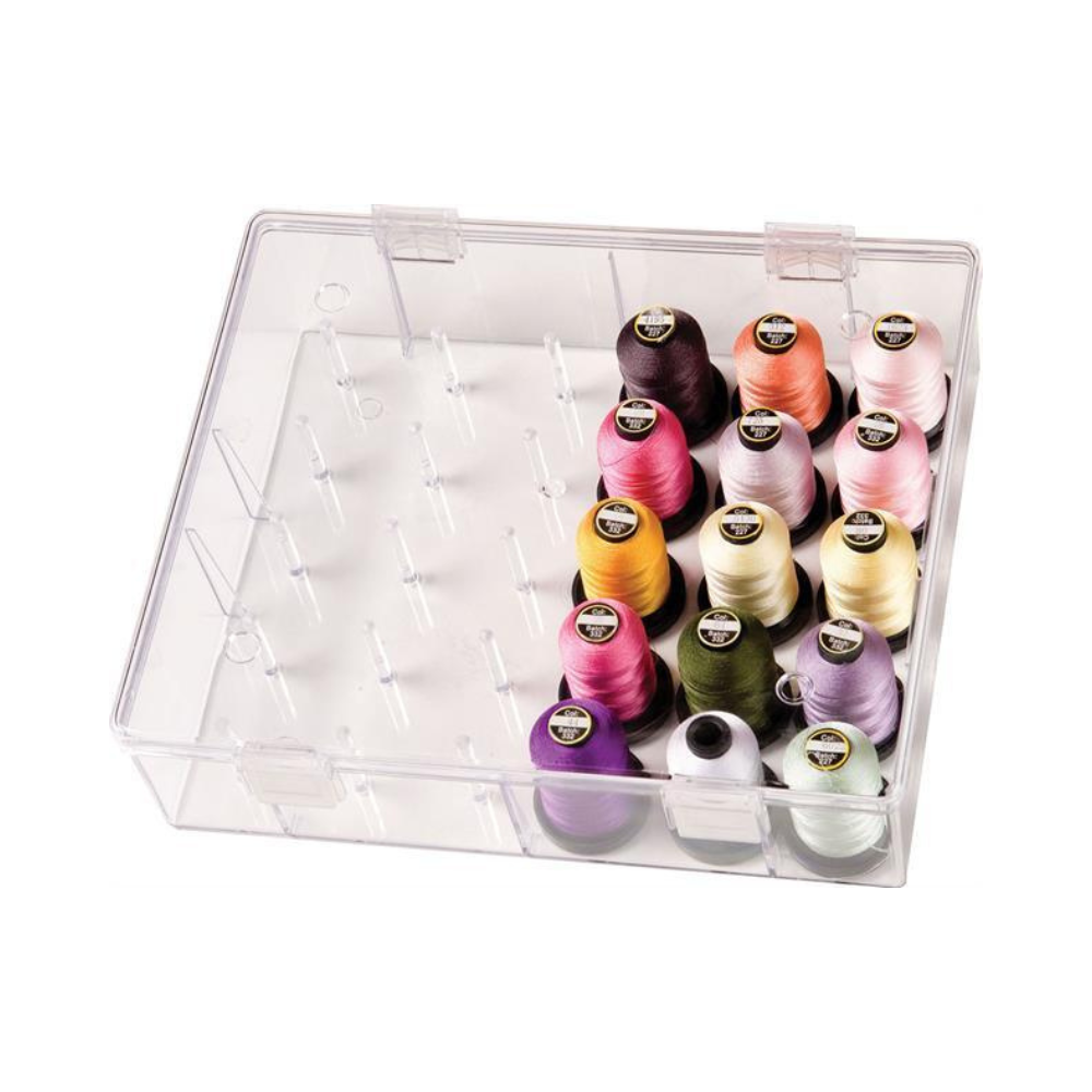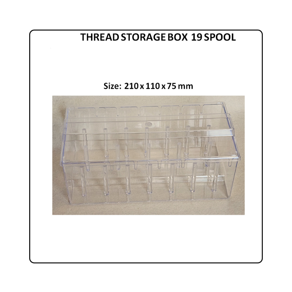 Thread Storage Box. Sewing / Embroidery Thread Box. A clear plastic, thread organiser that conveniently holds 19 sewing thread cones up to 70mm in height. Marathon, Seralon and Isacord threads fit beautifully. Can hold up to 30 smaller cones.